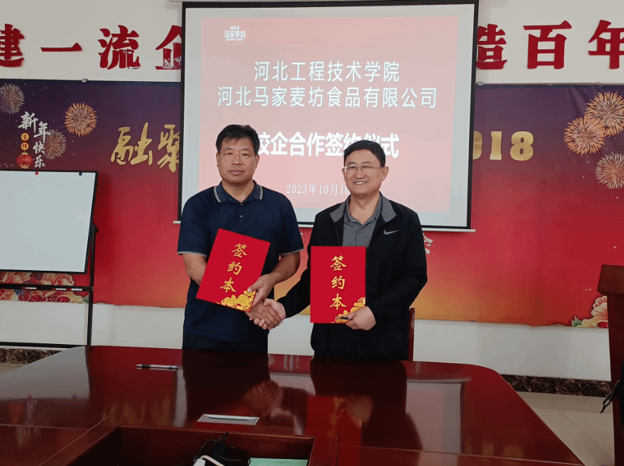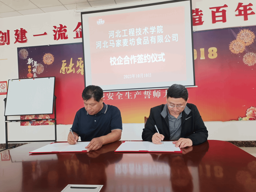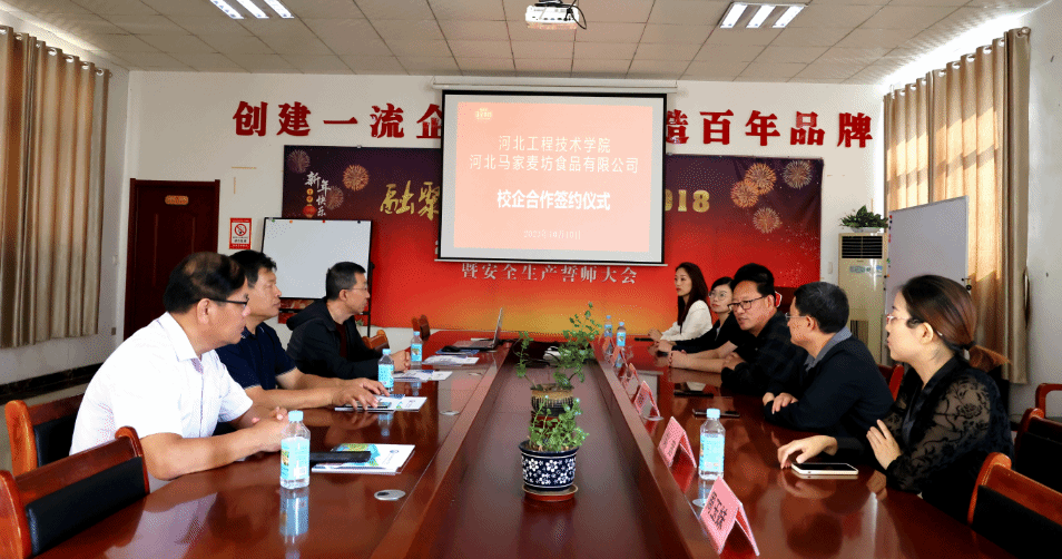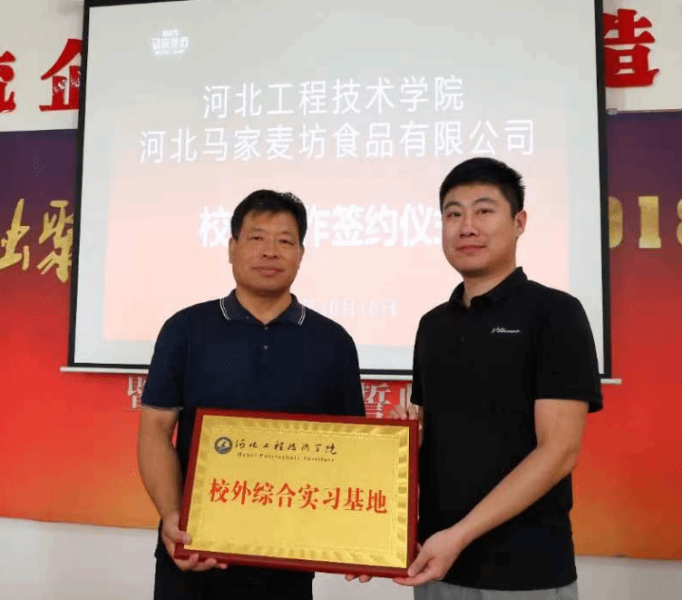 为进一步推进校企合作内涵建设,坚持走产教融合之路,推动区域特色农业产业提质升级,10月10日上午,我校与河北马家麦坊食品有限公司成功举行校企合作签约授牌仪式,共建校外综合实习基地。出席签约仪式的嘉宾有校企合作与社会服务部部长王俊昆、商学院院长王明吉、商学院党总支书记刘茜、商学院院长助理王昊、土木工程学院副院长李伟娜、艺术与传媒学院副院长张会改、栾城区科协党组成员主任科员张荣堂、栾城区科协原党组书记主席王增强、栾城区科协办公室主任邱丽军、河北马家麦坊食品有限公司董事长马建刚。