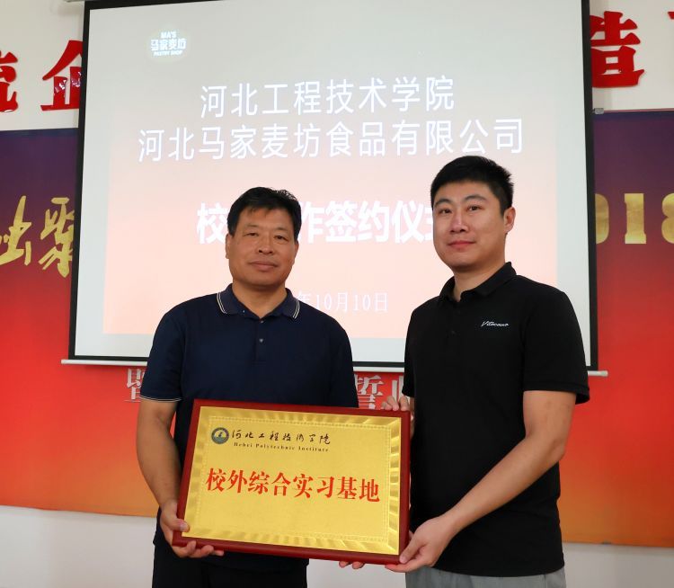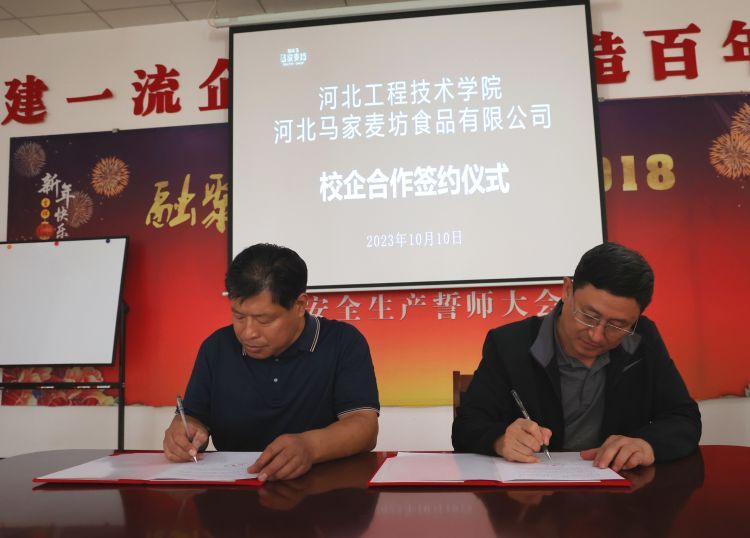 在签约仪式上,王俊昆部长首先对公司的信任支持和热情接待表示真诚感谢,对学校的发展历史、办学规模、办学定位做了简要介绍,希望进一步加强产学研合作,为校企合作的内涵建设奠定基础。河北马家麦坊食品有限公司董事长马建刚致辞中,对公司30多年的发展之路以及取得的成就进行简要的介绍,同时也表示校企合作是学校和企业共同发展的需要,也是企业反哺高校、推动高校教育事业发展的需要。